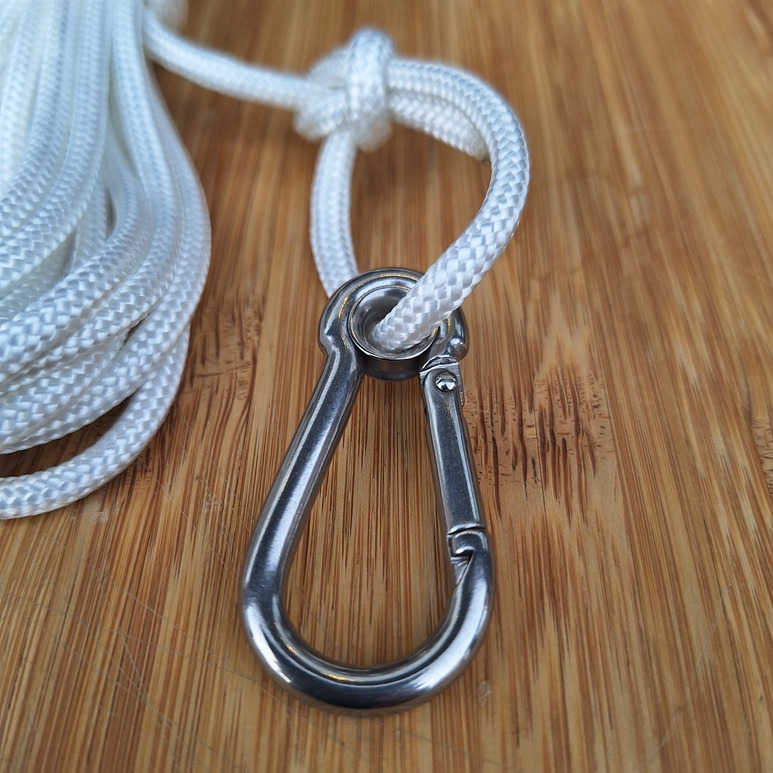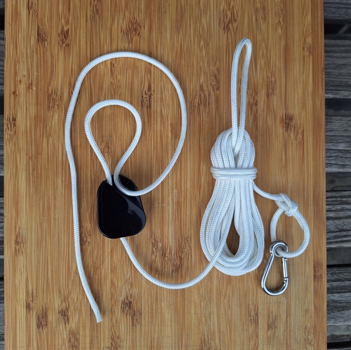 NB. Sættet er ikke samlet, du skal selv fastgøre karabinen og tørresnorstrammeren på snoren. Det er heldigvis meget let. Der følger en instruktion med, som du også kan se på et af billederne.
